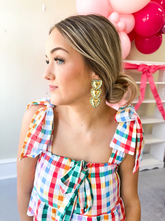 A beautiful 3 tiered heart earring featuring turquoise stones along the edges of each heart.