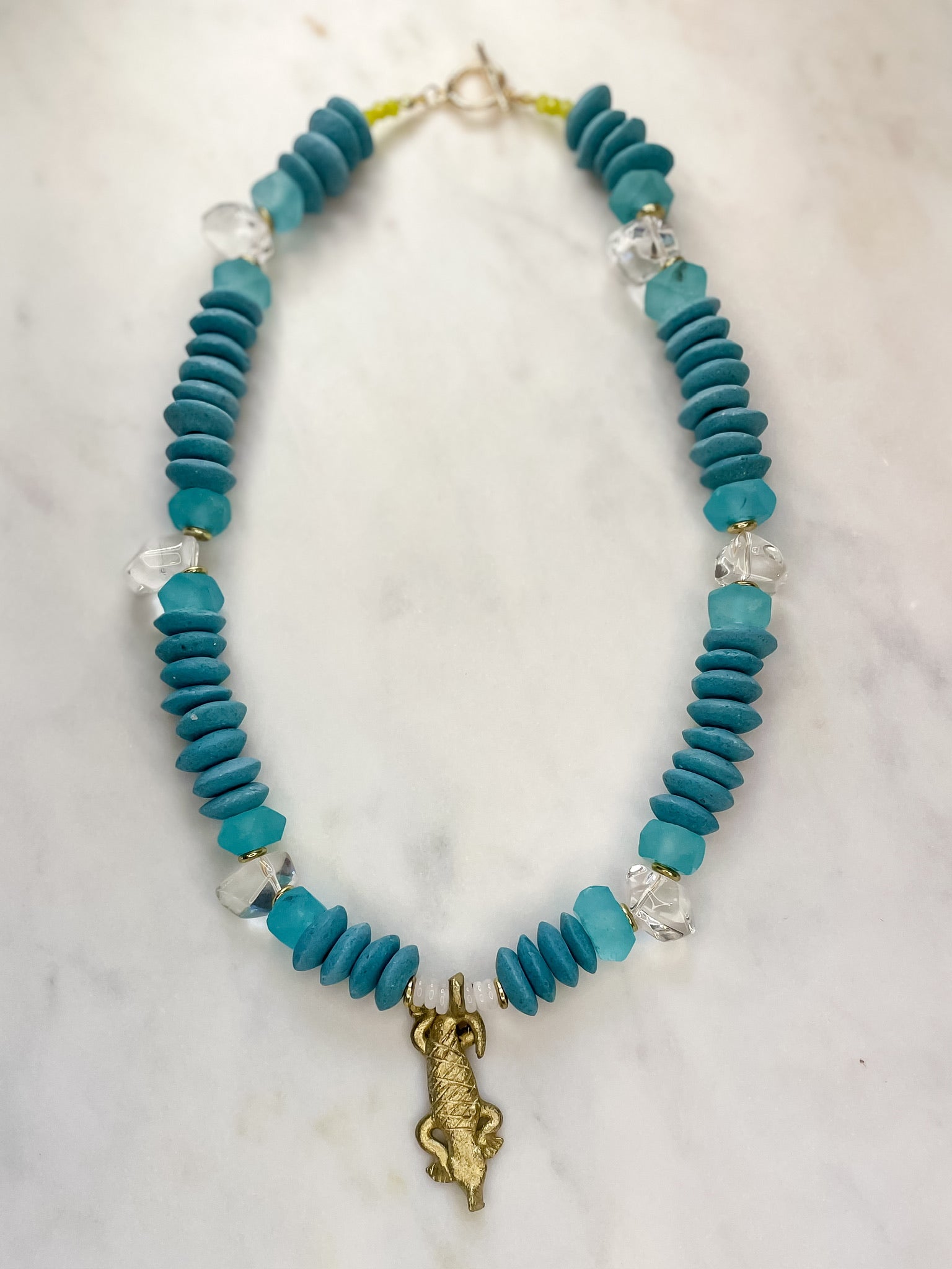 Gold plated brass flower with a turquoise stone, surrounded by green cz stones.