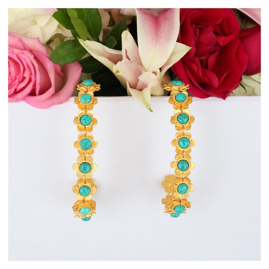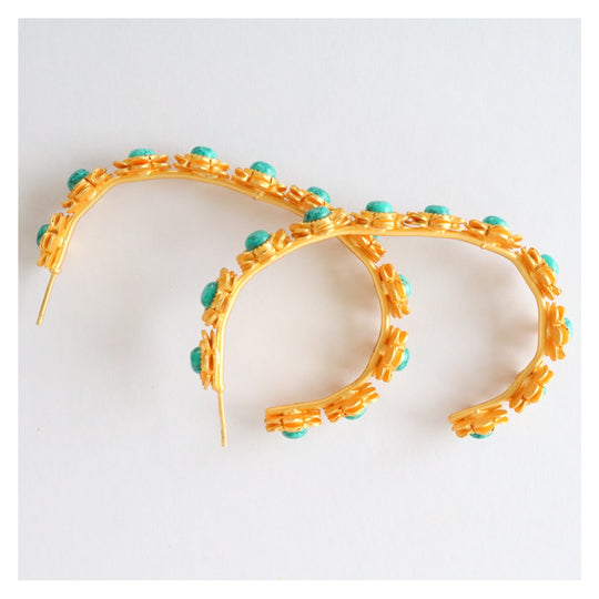 A beautiful gold floral hoop with turquoise stones in the center of each flower.