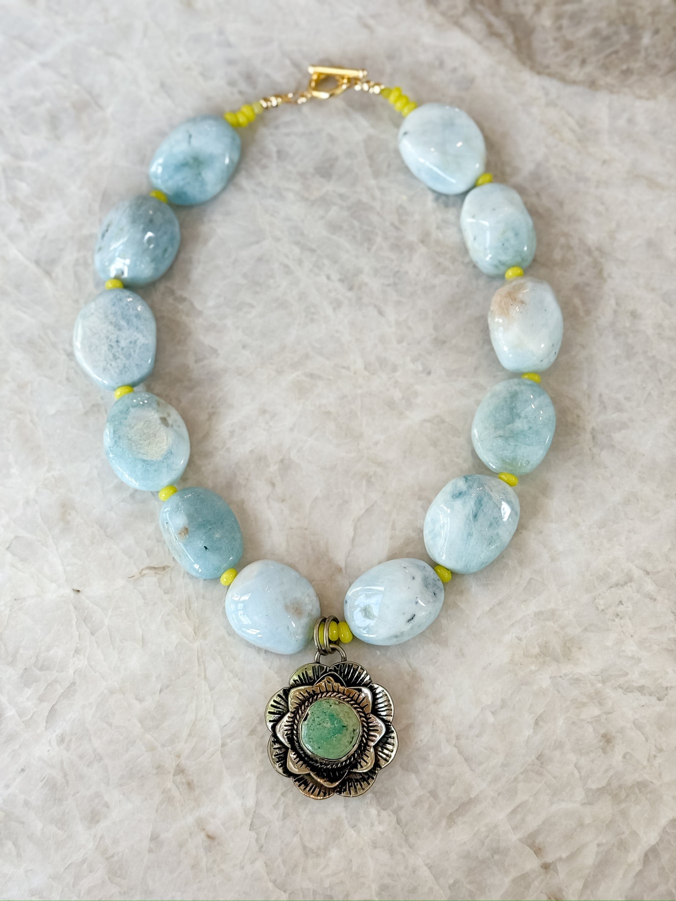 Beaded necklace that showcases amazonite beads and a unique silver and turquoise pendant with a delicate 14K gold-plated toggle clasp.