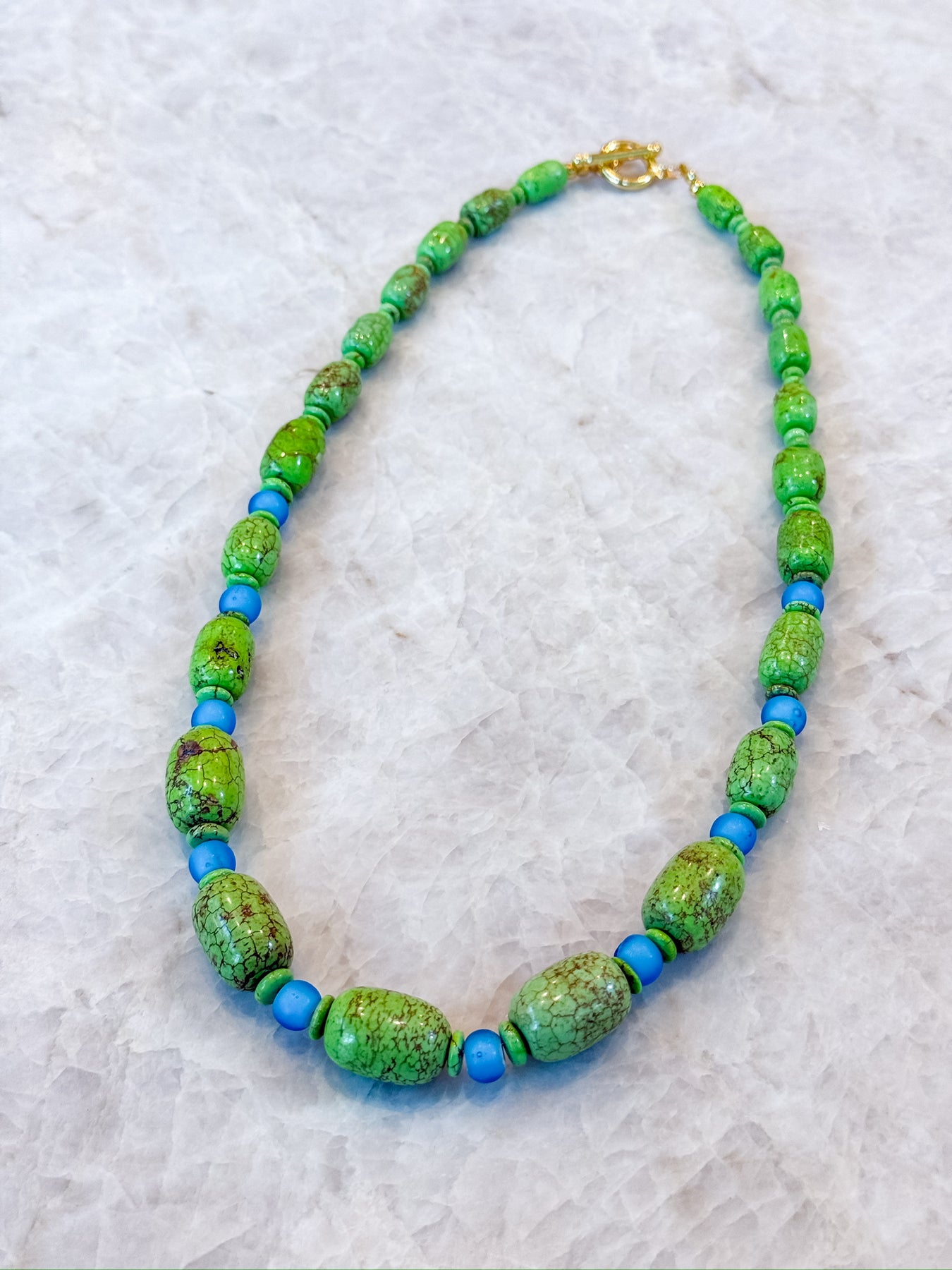Beaded necklace that showcases green beads and blue beads with a delicate 14K gold-plated toggle clasp.