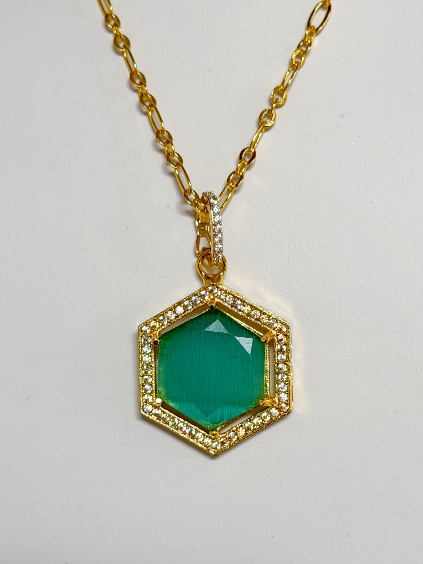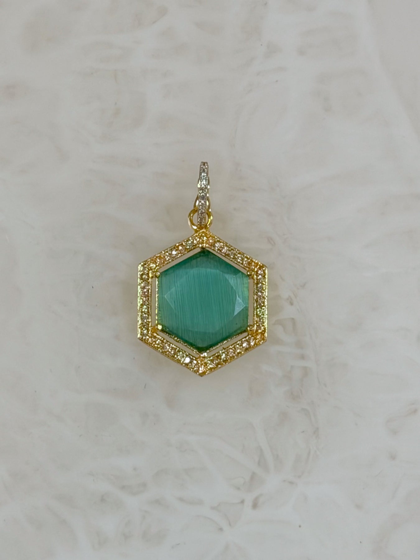 18K gold dipped pendant with pave edging and a green stone. Featuring a pave clasp that opens and closes. Wear wit one of our gold necklaces or attach it to one you own!