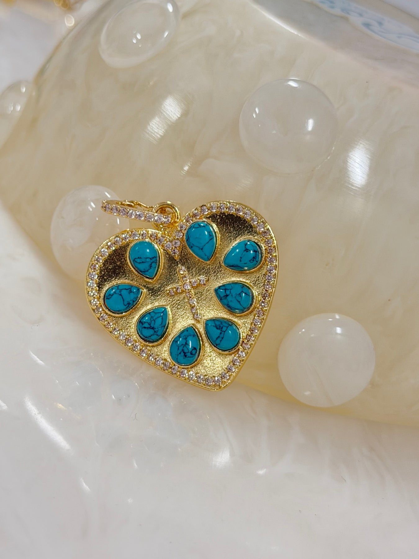 18K gold dipped pendant with pave edging and turquoise stones. Featuring a pave clasp that opens and closes. Wear wit one of our gold necklaces or attach it to one you own!