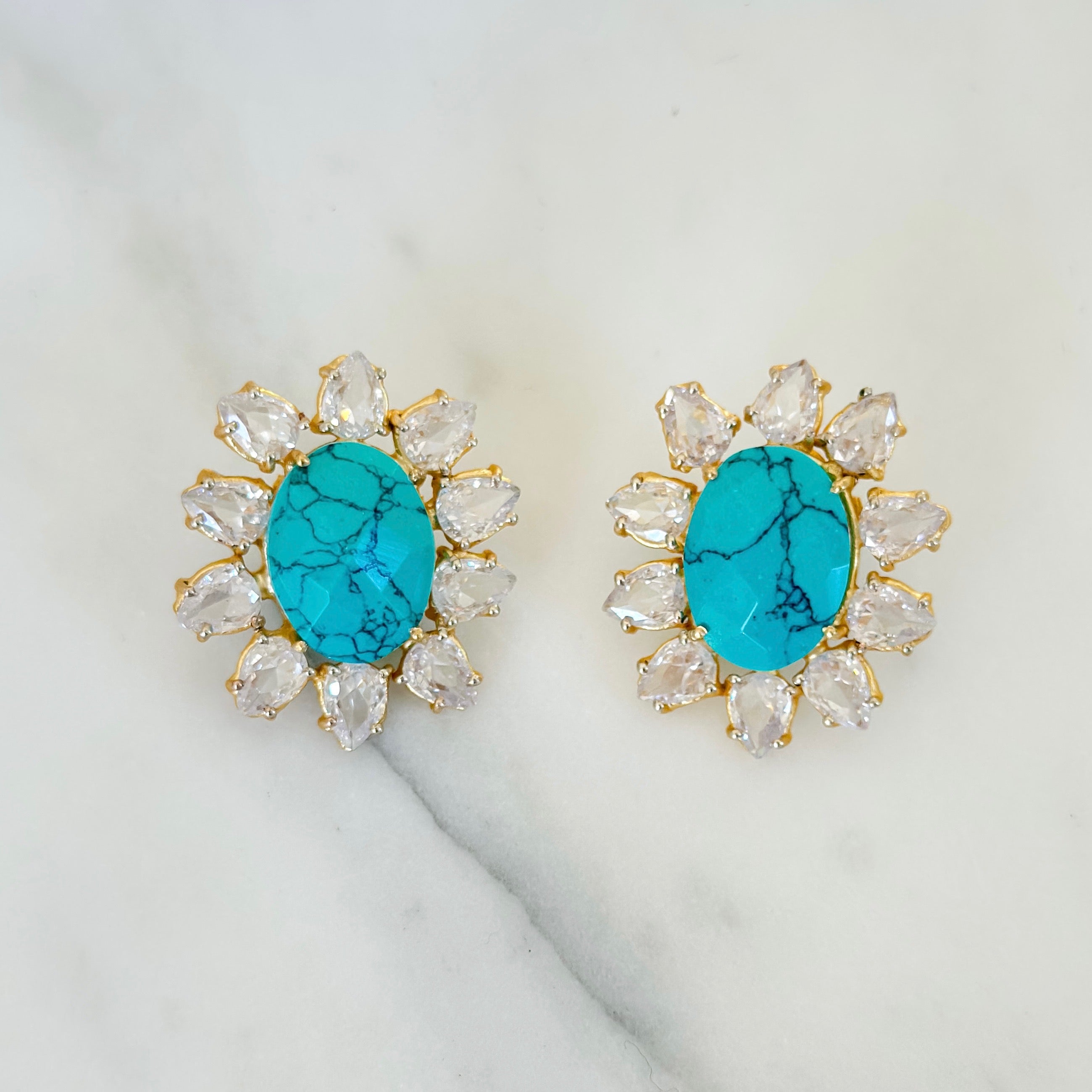 Gold plated brass flower with a turquoise stone, surrounded by green cz stones.